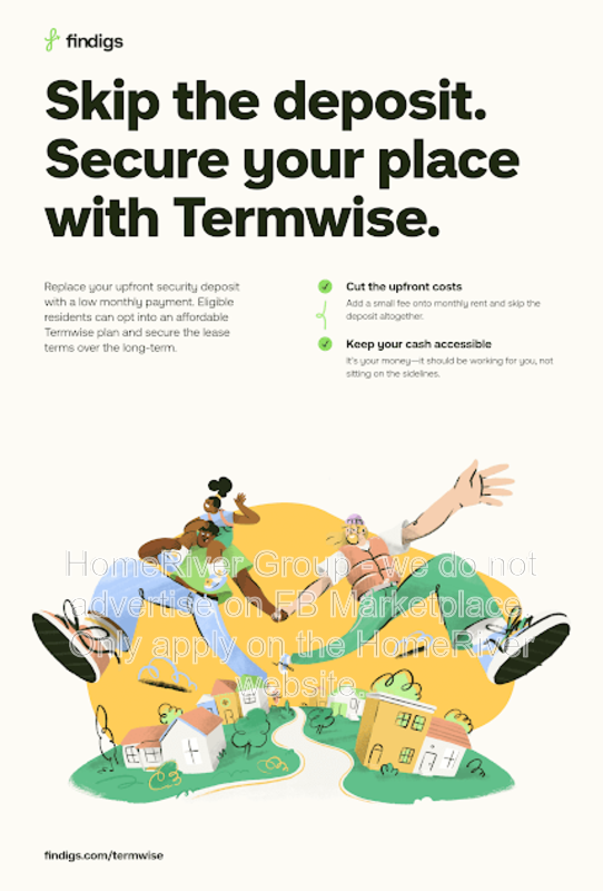 HomeRiver Group has partnered with Termwise to offer an affordable alternative to an upfront cash security deposit. Eligible residents can choose between paying an upfront security deposit or replacing it with an affordable Termwise monthly security deposit waiver fee. For more information, ask your leasing agent or visit: https://www.findigs.com/blog/skip-the-deposit-with-termwise-a-new-way-to-secure-your-rental.
